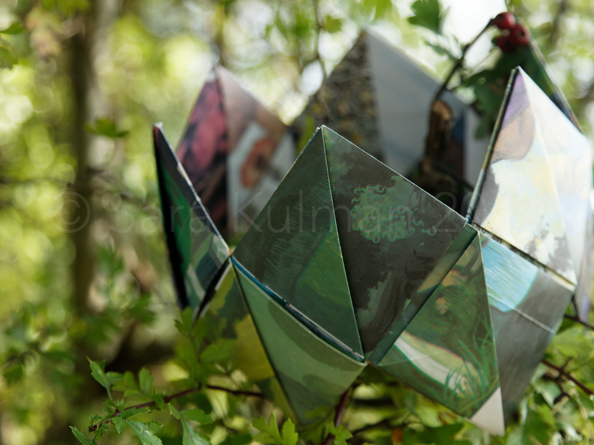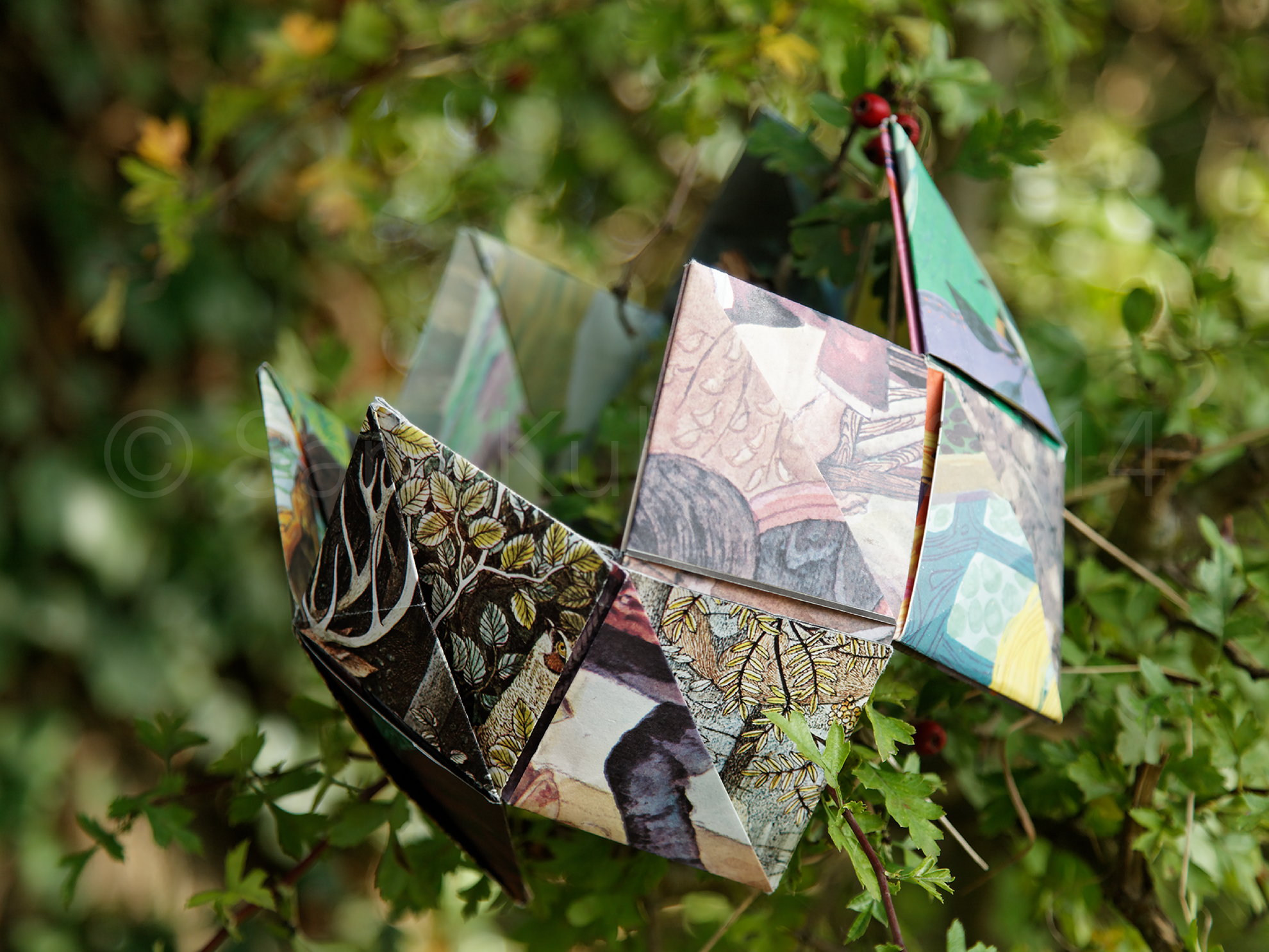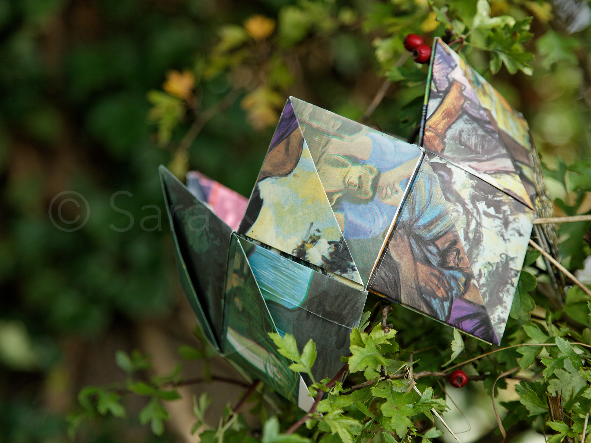 A variety of vintage Child Education posters from the 1960’s and 70’s were used to construct this crown. These posters have a flexible quality to them making them perfect for this project. I was given a large pile of these, and whilst some of the illustrations are excellent others are not and it is these which I have used. Once folded the illustrations disappear and in their place new designs, made from random selections, appear creating something quite magical.