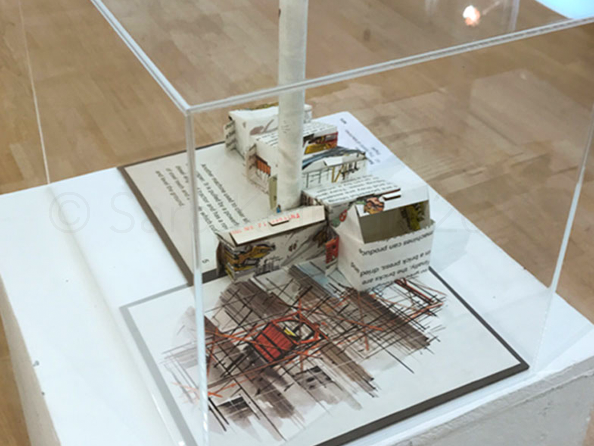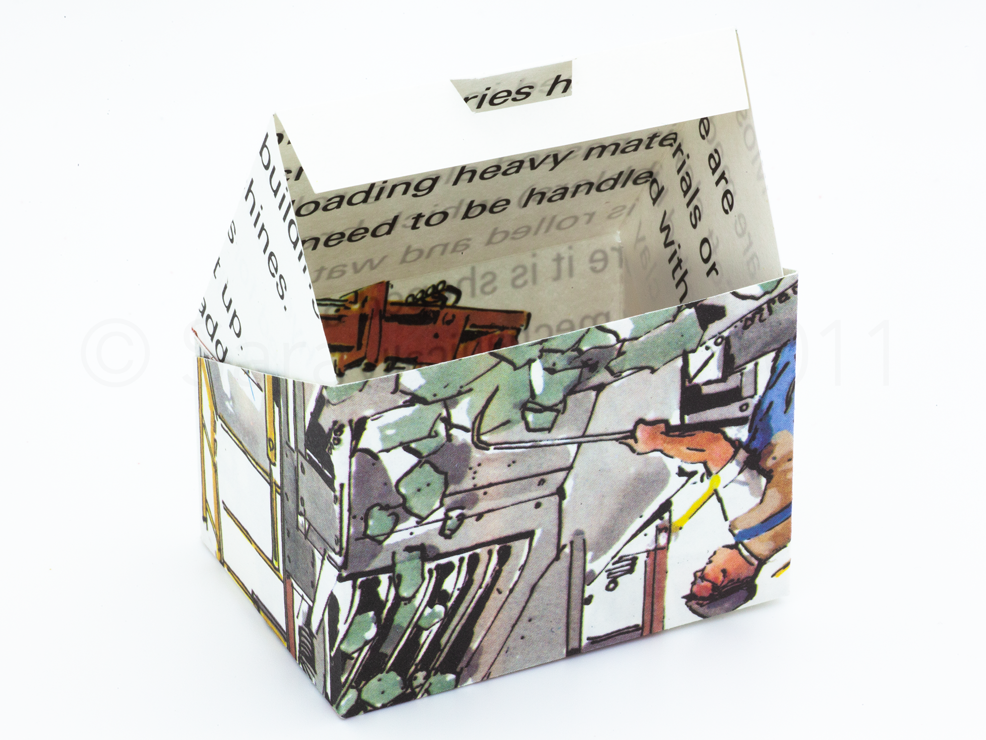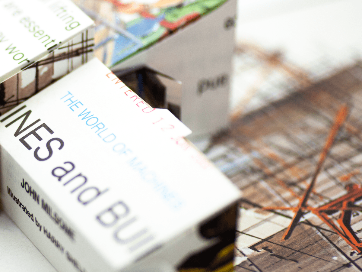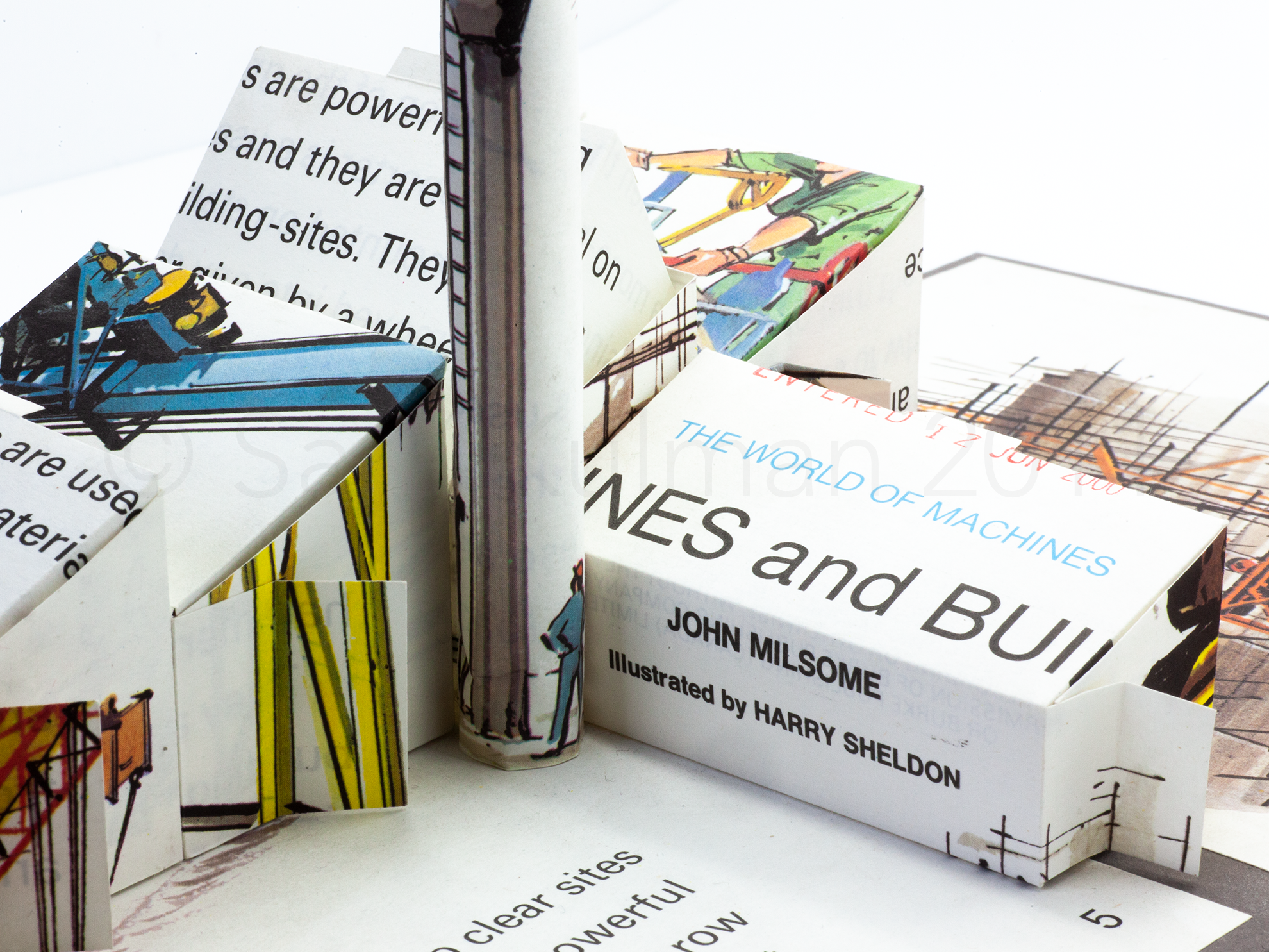 The World of Machines, 2011 evolved from instructions, given in Pleasure with Paper by A. van Breda, Faber and Faber 1956, designed for children to create their own toys. I used pages from The World of Machines: Machines and Building, John Milsome, illustrated by Harry Sheldon, Burke Books 1979 to construct my factory, adapting the buildings into boxes that can be opened to reveal images and type. Like Edward’s Brain the graphics determined where the folds would lie.